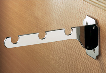 Tray or bag rail bracket with 296mm projection overall to accept three 25mm diameter rails. Rectangular back plate 120mm x 94mm overall. Polished Brass. Chrome. Satin Chrome. Stainless Steel.