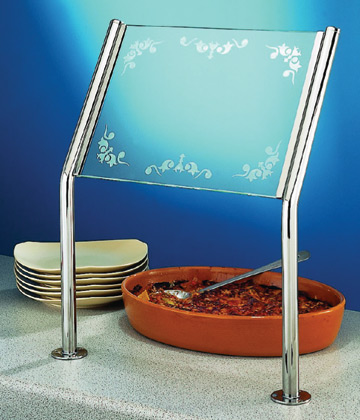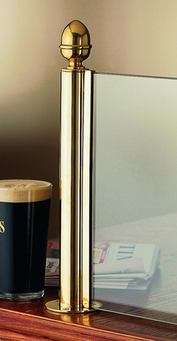 Self service sneeze screen from 32mm diameter tube. 250mm high pillar with 250mm cranked glass support or 300mm high pillar with 300mm cranked glass support or special sizes made to order. 63mm diameter base. Polished Brass. Chrome. Satin Chrom