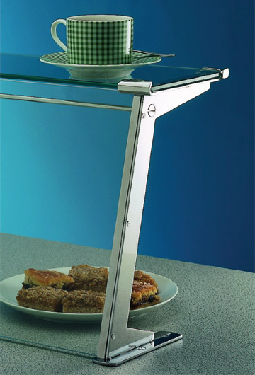 Sloping front pillar with top shelf. Available for 254mm high front glass with 152mm deep top shelf or for 305mm high front glass with 178mm deep top shelf. 148mm x 35mm fixing plate . Use of the W101 tie rod is recommended. Available as left or right hand end. Chrome. Satin Chrome.