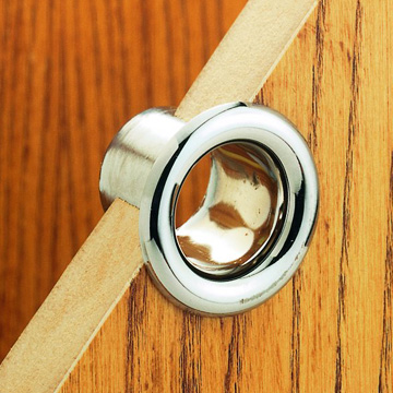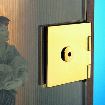 Large hinges for 6mm or 10mm glass to cabinet fitting. Two sections 75mm x 65mm locate over door, are connected with fixing through 14mm hole drilled in door and hinge against a panel screwed to side of opening. Supplied in pairs. Polished Brass. Chrome. Satin Chrome.