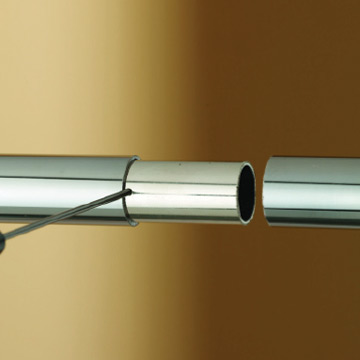 Round section pillars with 6mm or 10mm channels 25mm diameter stem on 75mm diameter base. Supplied as end, centre or any angle corner. Heights 375mm, 450mm, 525mm, 600mm, 750mm or other heights made to order. Chrome. Satin Chrome. Brass Dye Lacquered. Powder Coated Bronze.